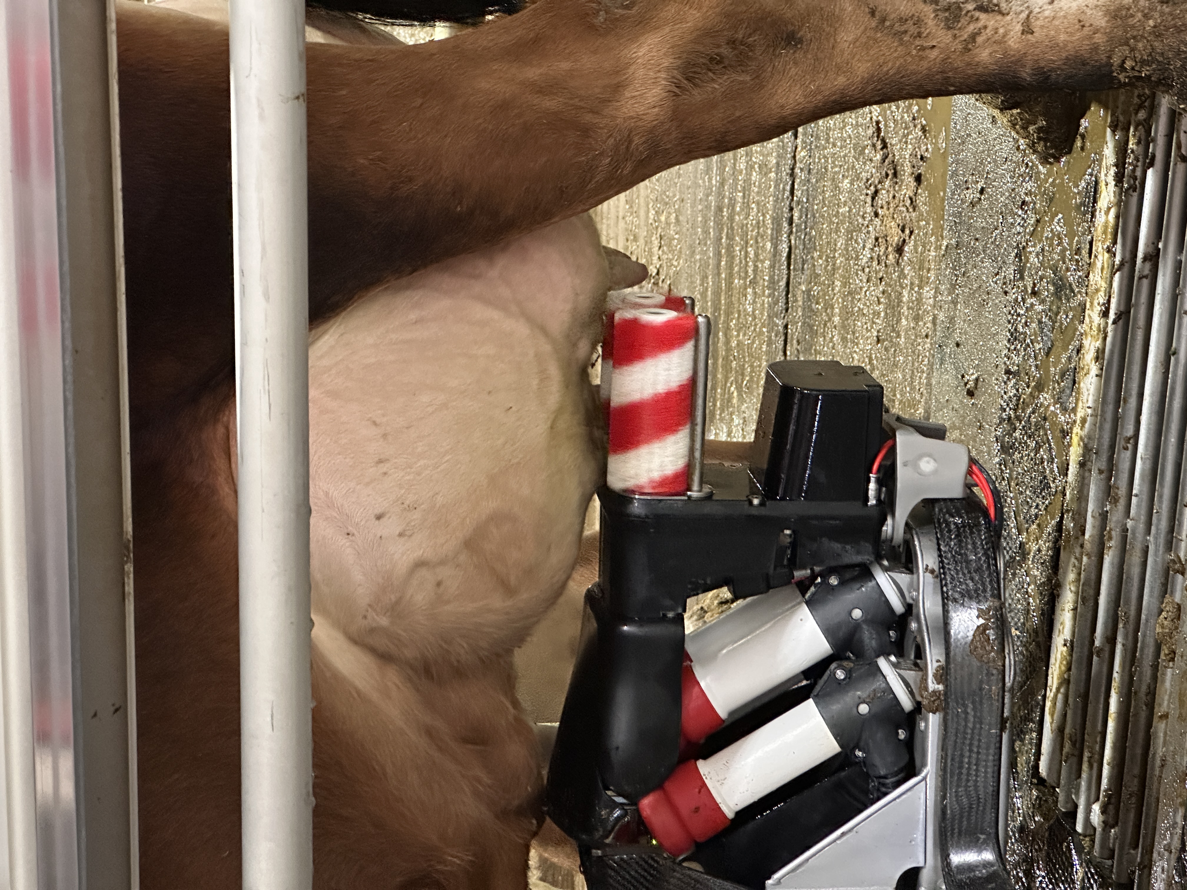 Each teat is cleaned between these brushesBeyond cleaning, the brushesTeats are acquired. The next cow is waiting, and studying us