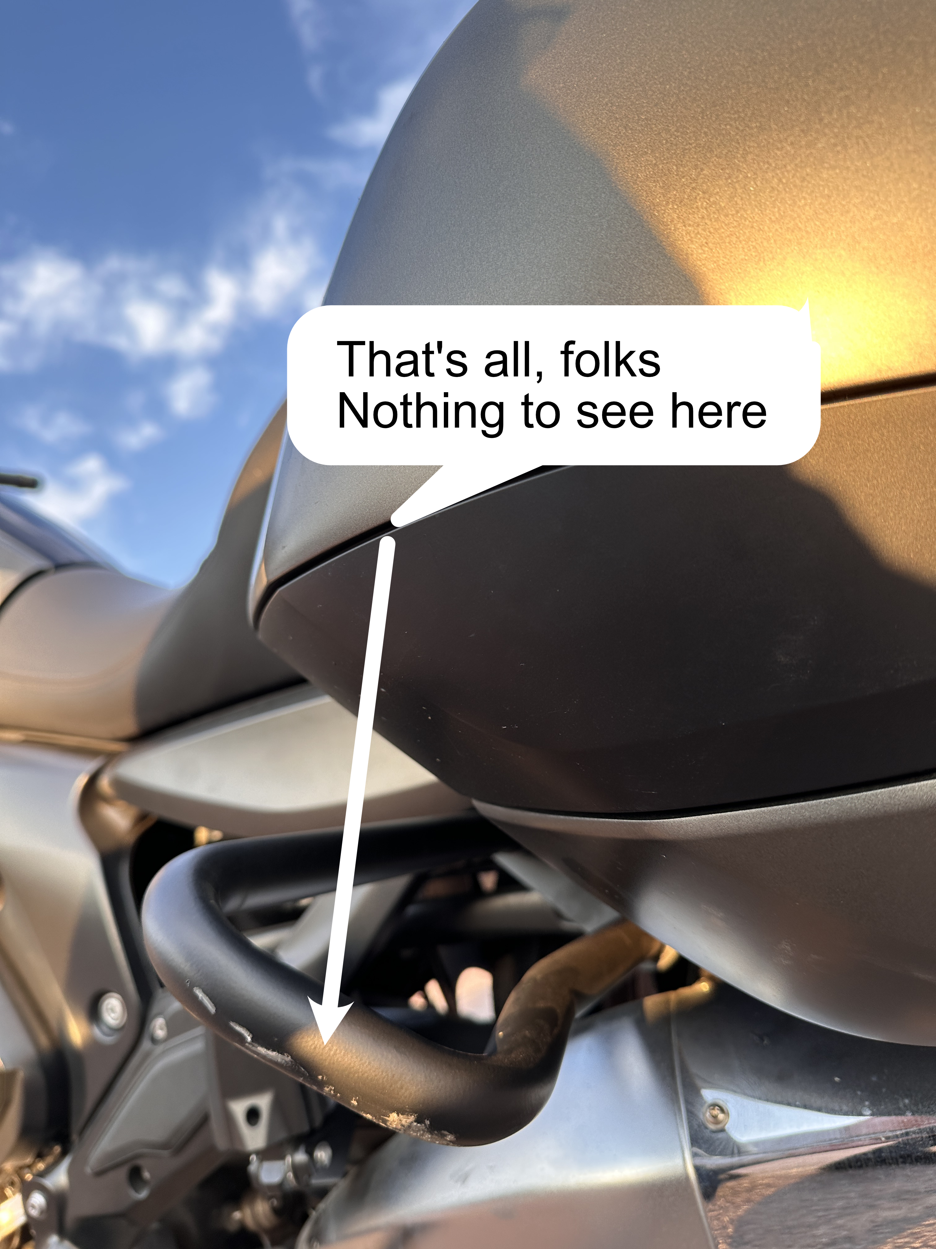We set the hunk straight, and all left happily. Me more than the two guys. Because before my trip I spent a good day installing crash bars on the bike. Tedious job, for various bike-architectural reasons. But: