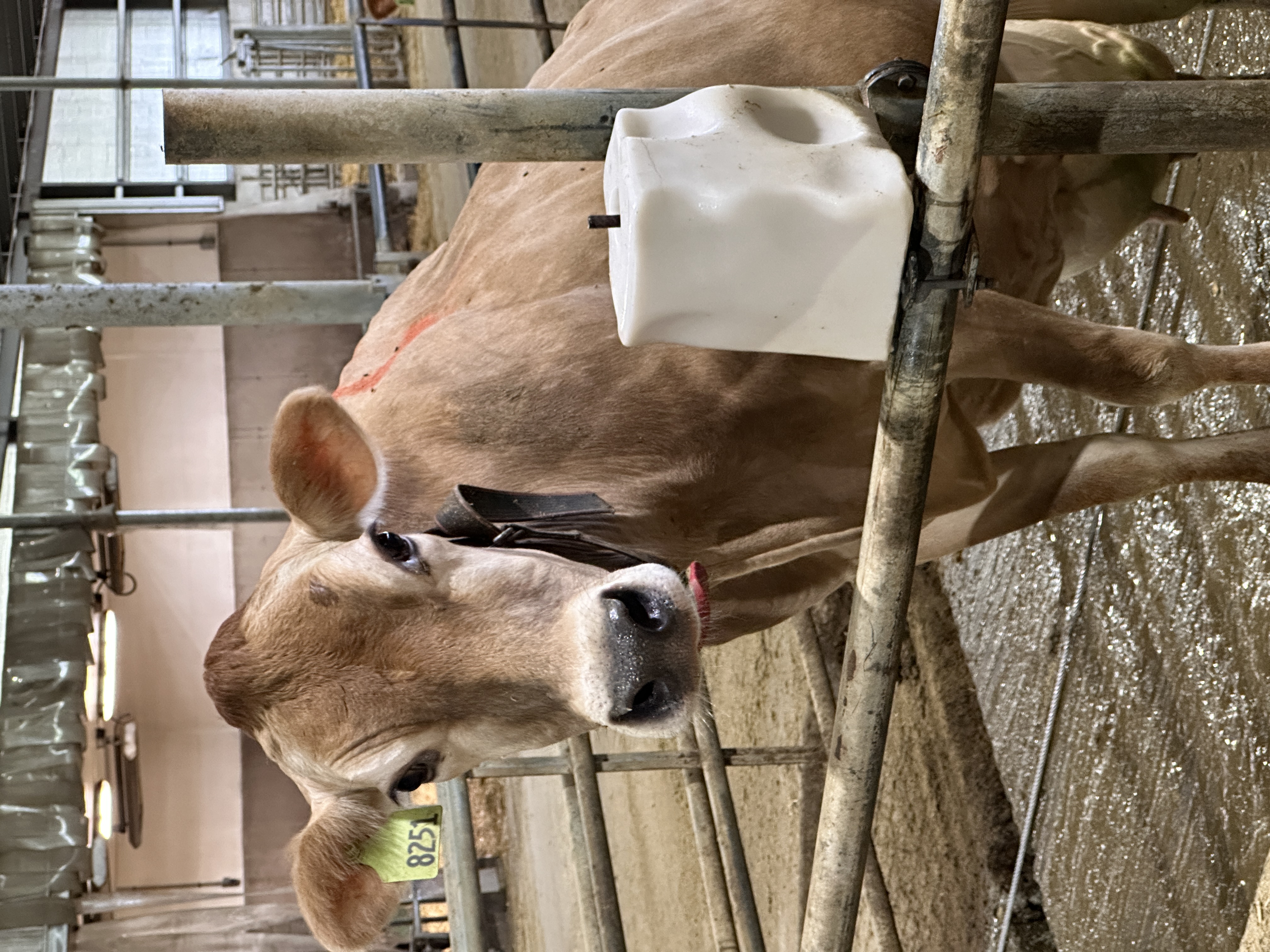 exit gate of the stall. The rear gate closes behind her to keep her peers out,