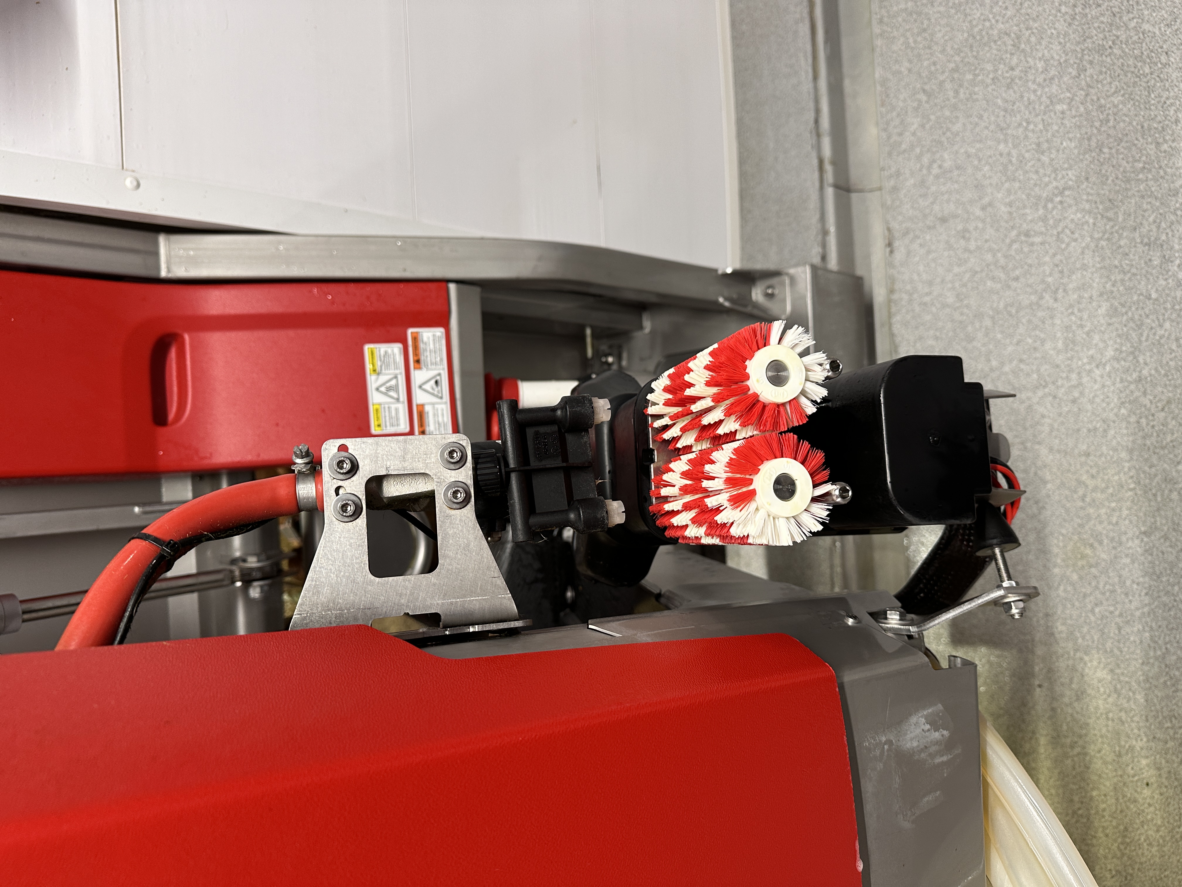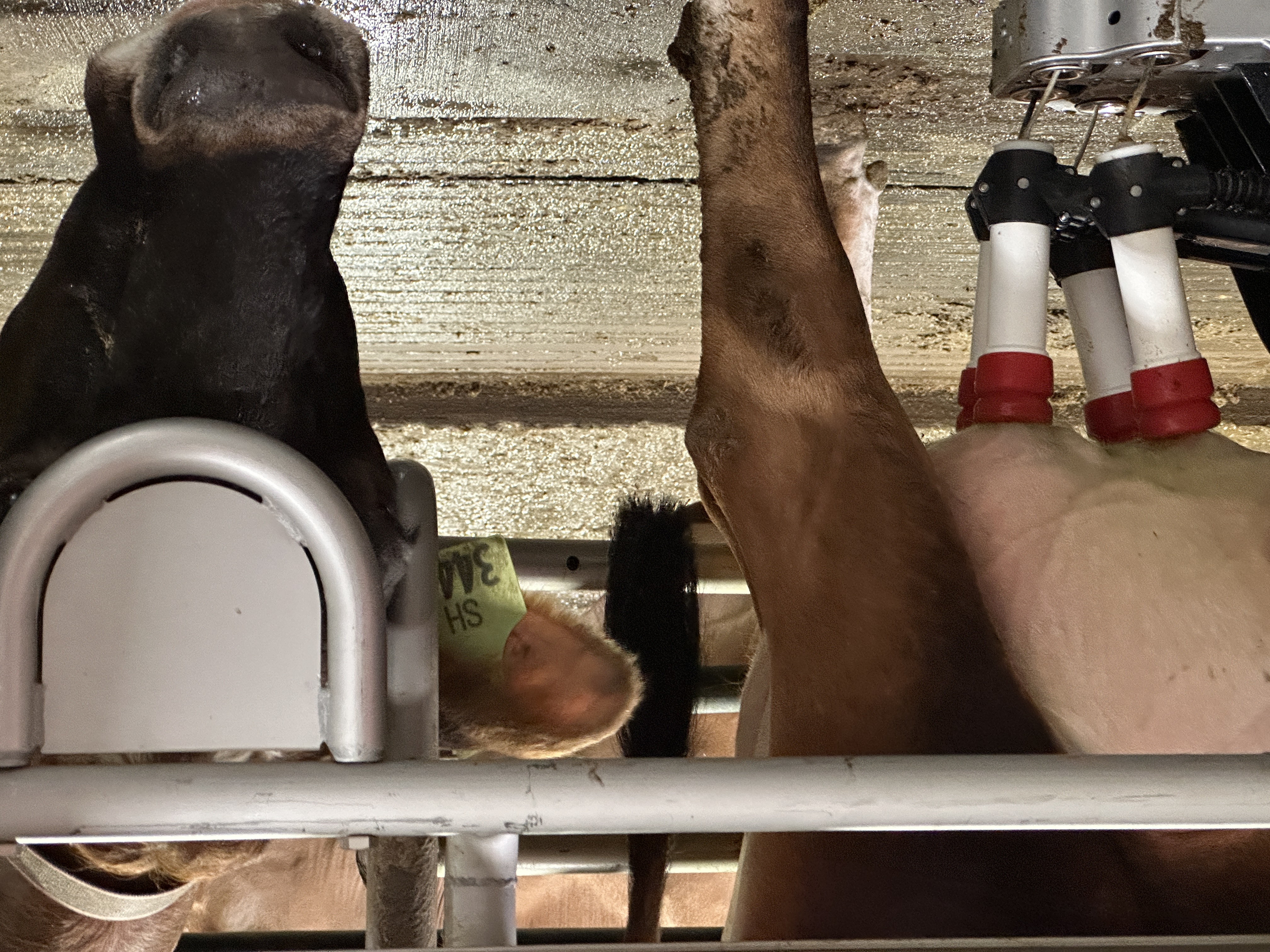 Each teat is cleaned between these brushesBeyond cleaning, the brushesTeats are acquired. The next cow is waiting, and studying us