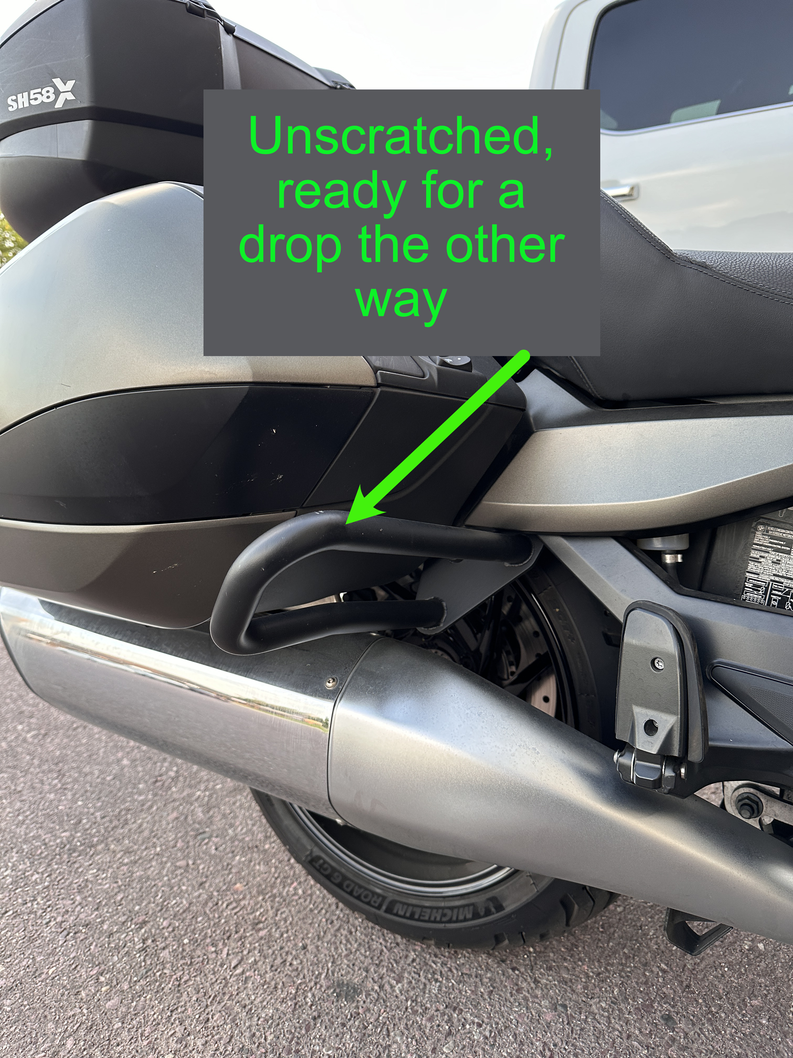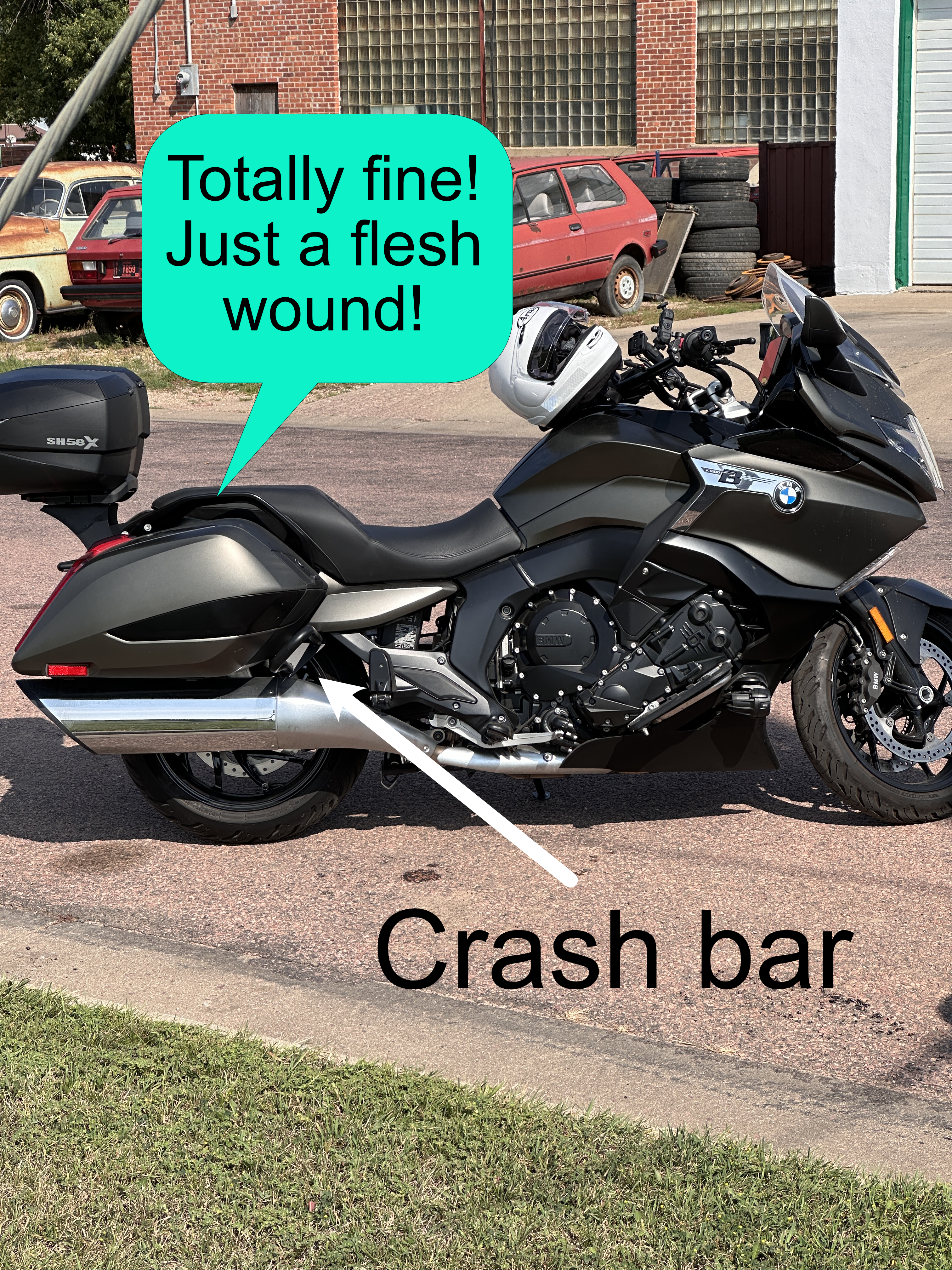 A related effect has the bike truly wanting to stay upright and stable at speed. But…, at near zero speed, gravity, and all the rest of it work entirely against you in every possible way. At crawling, the bike is allergic to any sudden change. As am I. And so, exiting a restaurant driveway to turn right into a road, I was only just barely rolling, looking left. The road was empty, so I figured I'd go without the full stop. Then I saw a car leave the same parking lot through another driveway up-road also via a left turn.